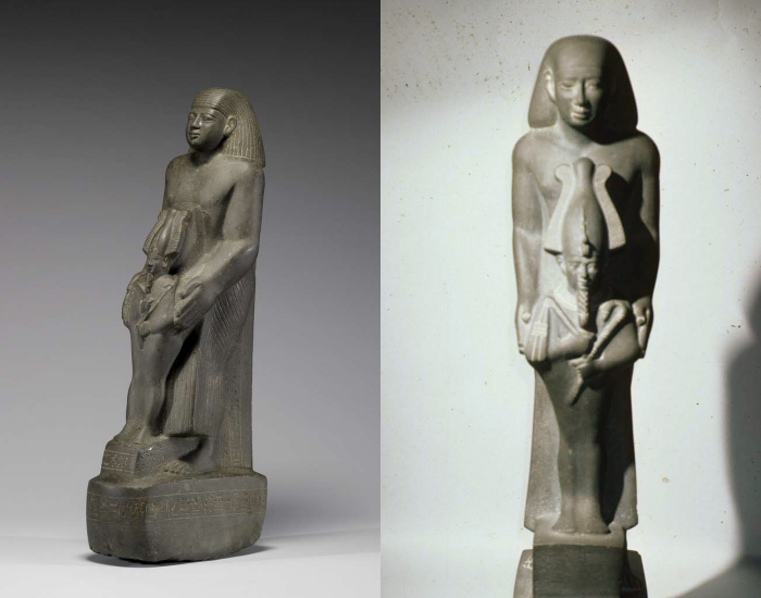 Statue of Harbes, also known as Psamtiknefer, son of Ptahhotep. Dated to 595–589 B.C., Late Period, Saite Dynasty. Now in the Metropolitan Museum of Art. The figure is shown presenting an offering to the god Osiris, likely intended as a votive dedication to a temple.