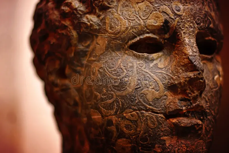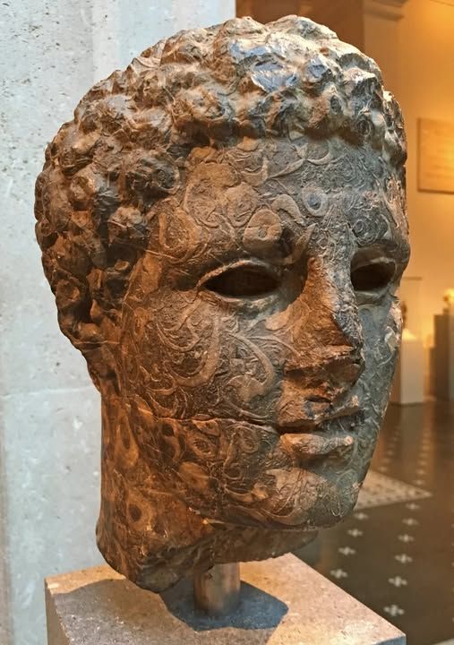 This sculpted head of a man is carved from lumachella orientale, a distinctive marble embedded with fossilized shells.