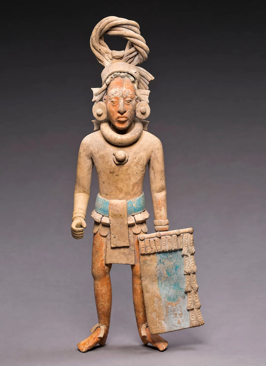 This terracotta figure depicts a Maya warrior holding a rectangular shield in one hand; the original wooden spear has been lost.