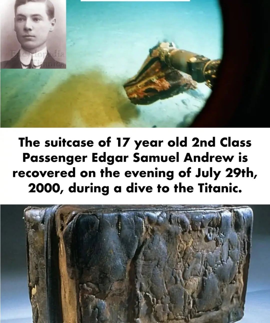 Edgar’s suitcase, a time capsule from the deep, brought his story back to the surface. It was a tangible connection to the past, a way for the world to remember that among the thousands of names on the passenger list, there were real people like Edgar—young men and women who were on the cusp of their lives, carrying their dreams in a small, hopeful suitcase, before their journey was tragically and abruptly ended.