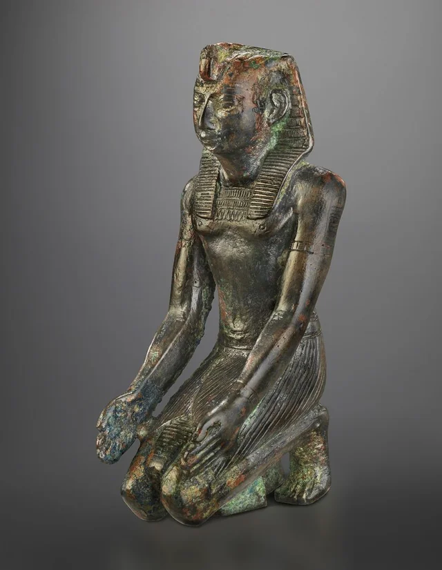 This bronze statuette depicts King Psamtik I in a kneeling pose, a gesture of devotion characteristic of royal offerings. Dating to the 26th Dynasty, it reflects the artistry and religious traditions of Egypt’s Late Period.