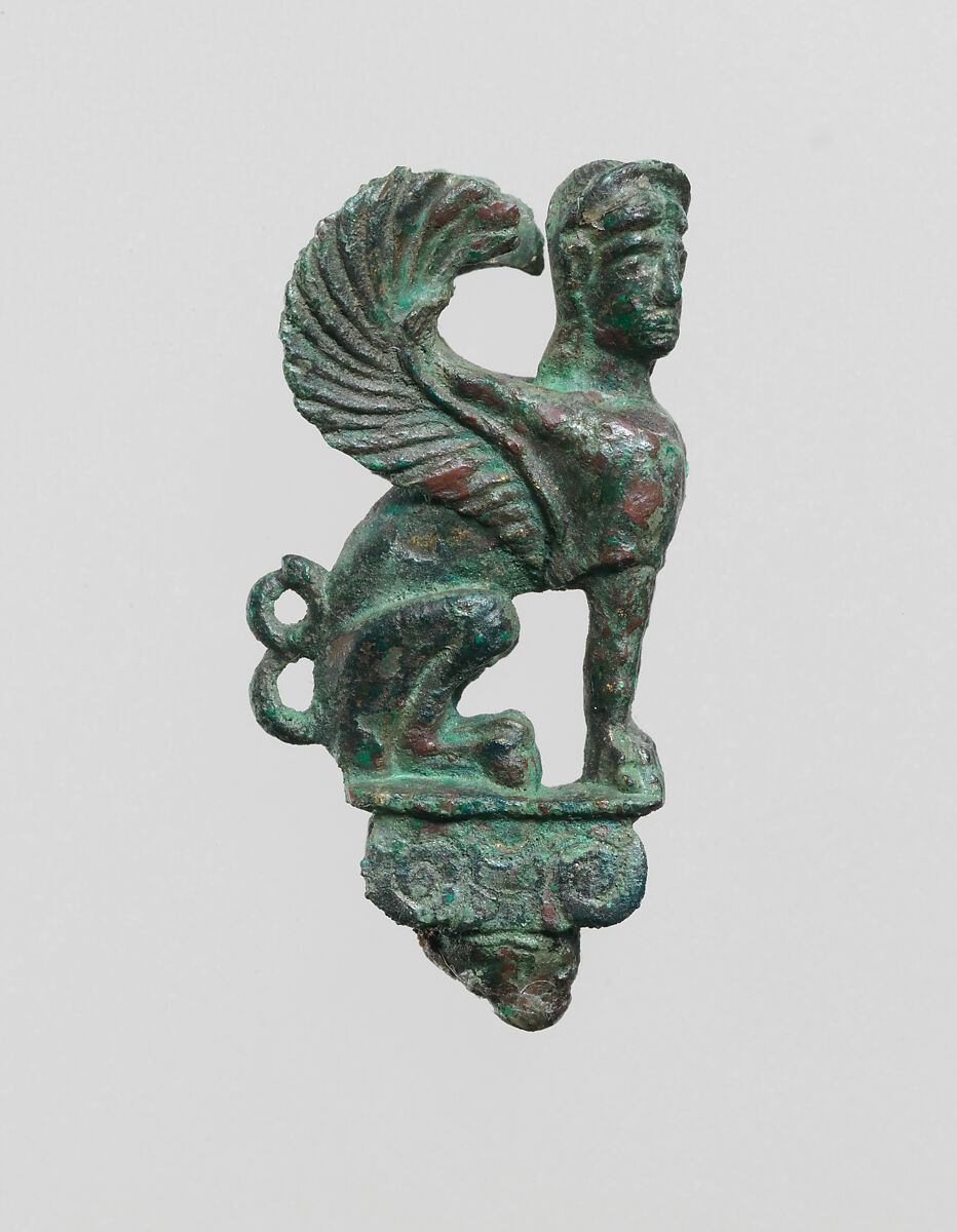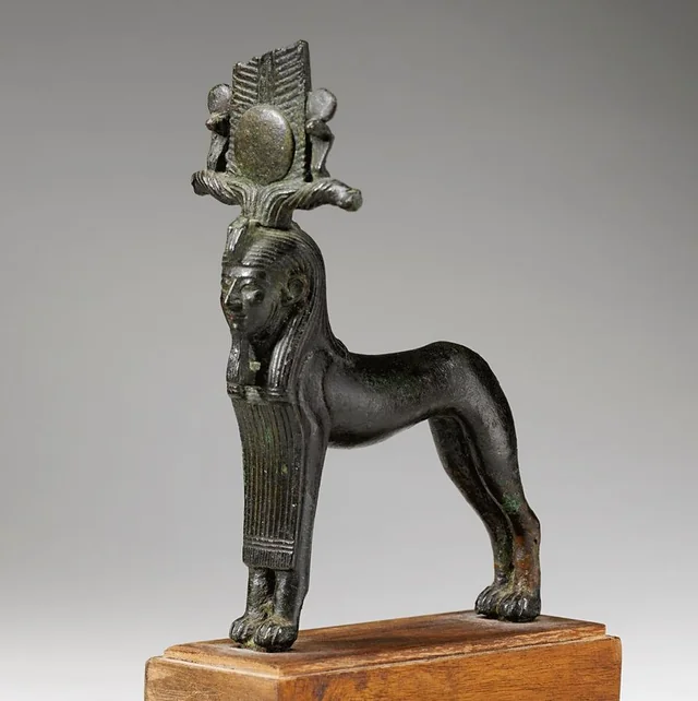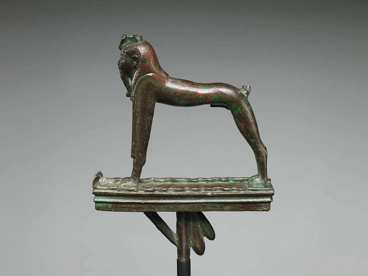 This bronze statuette depicts a sphinx mounted on a wooden standard. The figure may represent an unidentified deity or king, reflecting the dual symbolic role of the sphinx as both divine guardian and royal emblem.