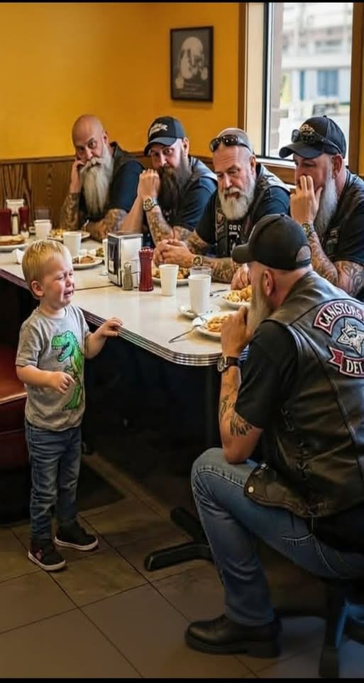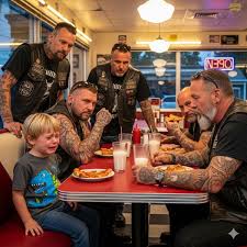 It began in the most unlikely of places—a roadside diner, a table crowded with bikers, and a boy no older than seven in a dinosaur T-shirt. He walked up, his voice trembling, and asked a question that froze the entire room: “Can you kill my stepdad for me?”