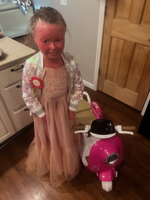 On this special day, she walked into the living room dressed like a princess. Her soft pink gown flowed gracefully to the floor, paired with a glittering jacket that sparkled with every movement. At her side stood her new gift, a pink scooter, waiting to take her on new adventures.