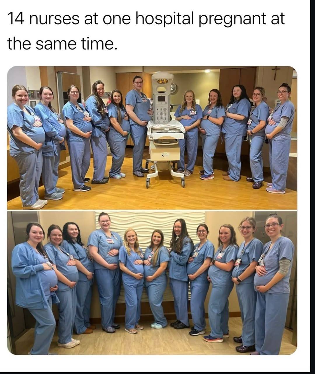 In the hallways of the HSHS St. Vincent Hospital’s Women and Infants Center in Green Bay, Wisconsin, there’s a unique kind of baby boom happening. It’s not among the patients, but among the very people who care for them: 14 maternity nurses, all expecting their own bundles of joy at the same time.