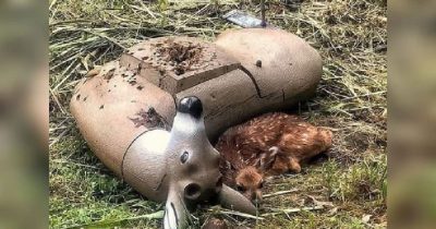 In the stillness of a meadow, a newborn fawn—barely able to stand on its shaky legs—nestled against the side of a plastic deer, a decoy scarred with bullet holes. Too young to know fear, it pressed its tiny body against what it thought was its mother, seeking warmth, safety, and love. 💔