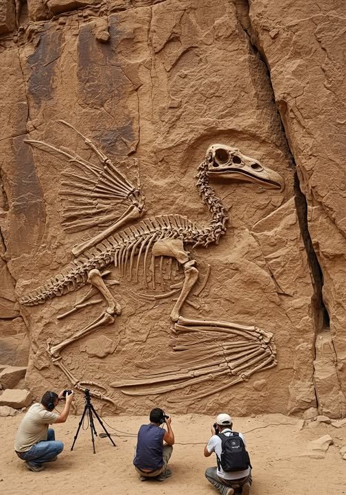 Archaeologists working at a remote excavation site have uncovered what may be one of the most sensational finds in modern history: the fossilized remains of a colossal winged creature, embedded directly into a towering cliff face.