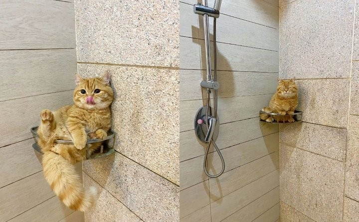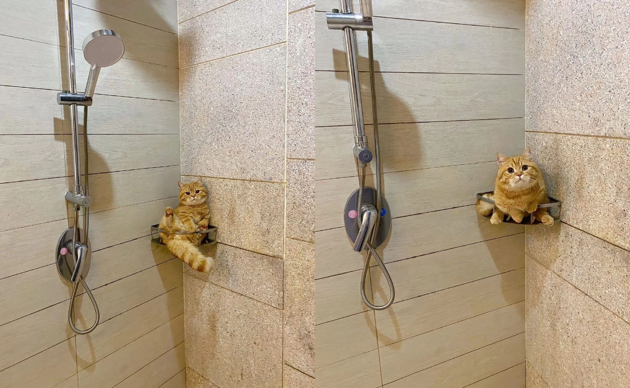 Every morning, without fail, my cat follows me into the bathroom like a shadow with whiskers. The moment the water turns on, he leaps gracefully onto the highest shelfโhis personal throne. From there, he sits tall and unblinking, tail curled neatly around his paws, watching me as though I am his loyal servant performing some sacred ritual. ๐โจ
