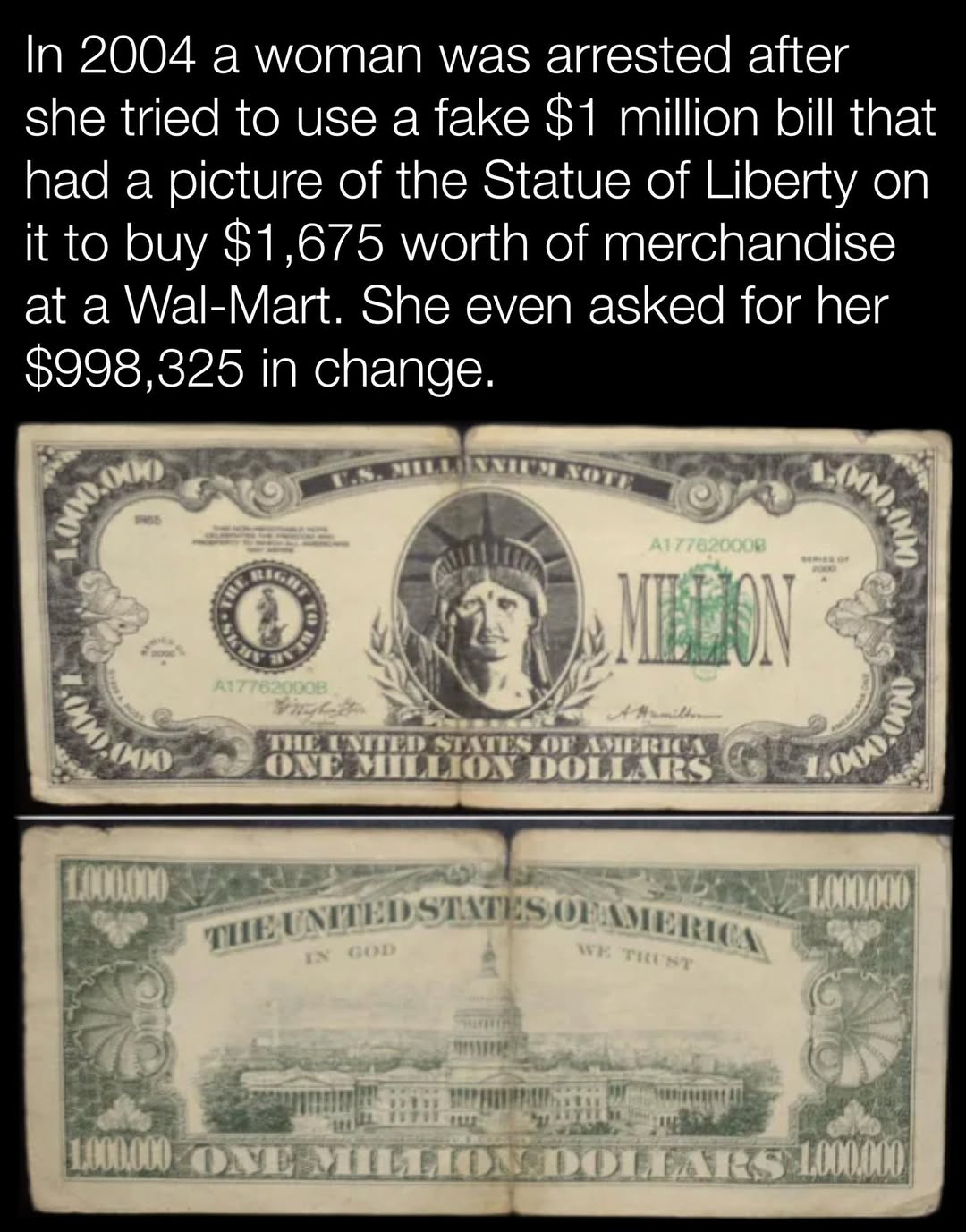 The Wal-Mart clerk immediately recognized the bill as fake and alerted management, who then called the police. Before her arrest, Pike reportedly tried to use two low-value gift cards to complete the purchase, but upon that failure, she pressed the issue with the million-dollar note again.