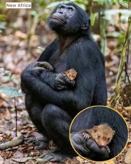 The sight, which was photographed in Salonga National Park, was startling in its stillness and profound kindness. The bonobo, an ape known for its peaceful, highly social, and empathetic nature—and sharing 98% of its DNA with humans—was not hunting or harming the small mammal. Instead, it was simply cradling it gently, like a mother or a friend.