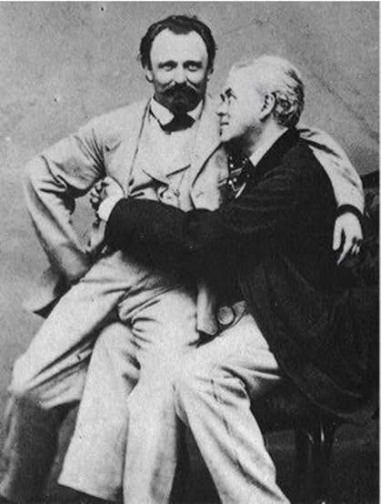 In an era when most studio portraits were stiff, serious affairs designed to convey status and formality, this image is striking for its intimacy. One man is seated comfortably, almost casually, in the lap of the other, their bodies touching. Both men are smiling—a rarity in period photography—as though the camera had caught them in the middle of a private, secret joke.