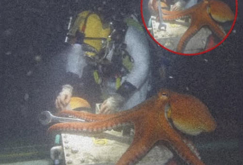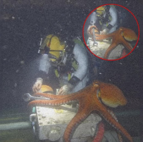 Whenever the diver reached for a wrench, a bolt, or even dropped a tool, a tentacle would appear, gently handing it back. It was as if a silent, eight-armed assistant had appeared from the depths, calmly aiding in the work without hesitation.