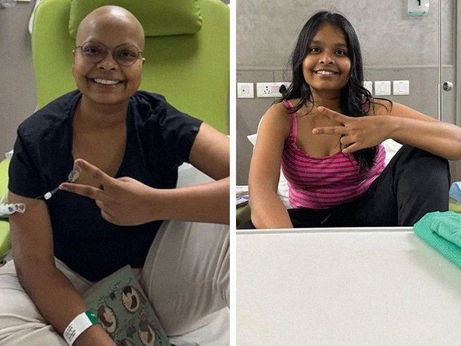 Today marks the final day of chemoโa chapter of life defined by both unimaginable pain and extraordinary courage comes to an unforgettable close. ๐ช On one side, she sits quietly, bald from the relentless fight, yet her posture radiates resilience; her trembling hands lift in a peace sign that quietly proclaims, โI am still here, I have not surrendered.โ Her eyes, though weary, reflect a fire that refused to be extinguished. On the other side, the same face beams with radiant energyโhair softly returning, cheeks glowing, and a smile so full of life it seems to light up the room. ๐โจ