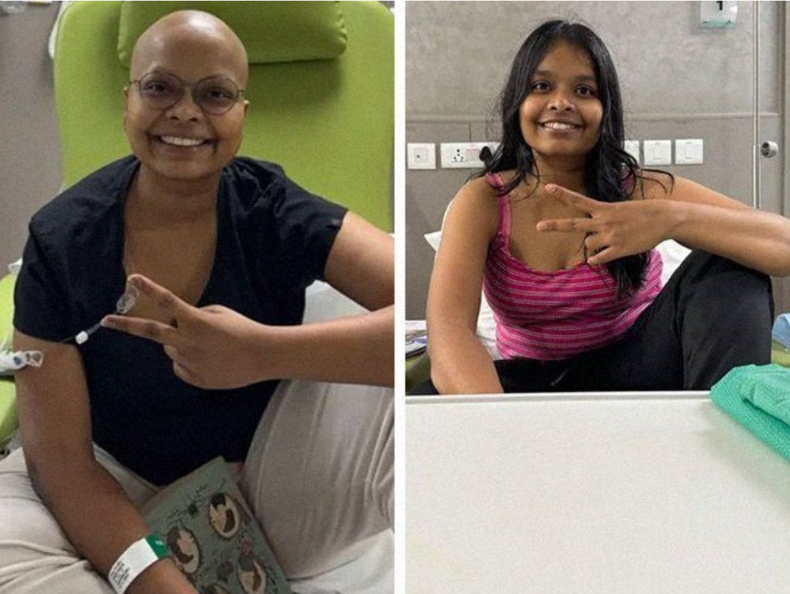 Today marks the final day of chemo—a chapter of life defined by both unimaginable pain and extraordinary courage comes to an unforgettable close. 💪 On one side, she sits quietly, bald from the relentless fight, yet her posture radiates resilience; her trembling hands lift in a peace sign that quietly proclaims, “I am still here, I have not surrendered.” Her eyes, though weary, reflect a fire that refused to be extinguished. On the other side, the same face beams with radiant energy—hair softly returning, cheeks glowing, and a smile so full of life it seems to light up the room. 🌈✨