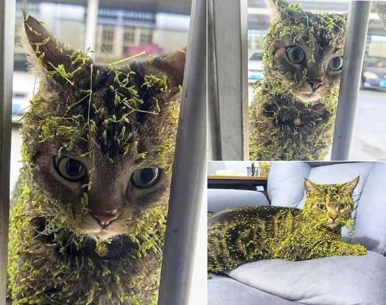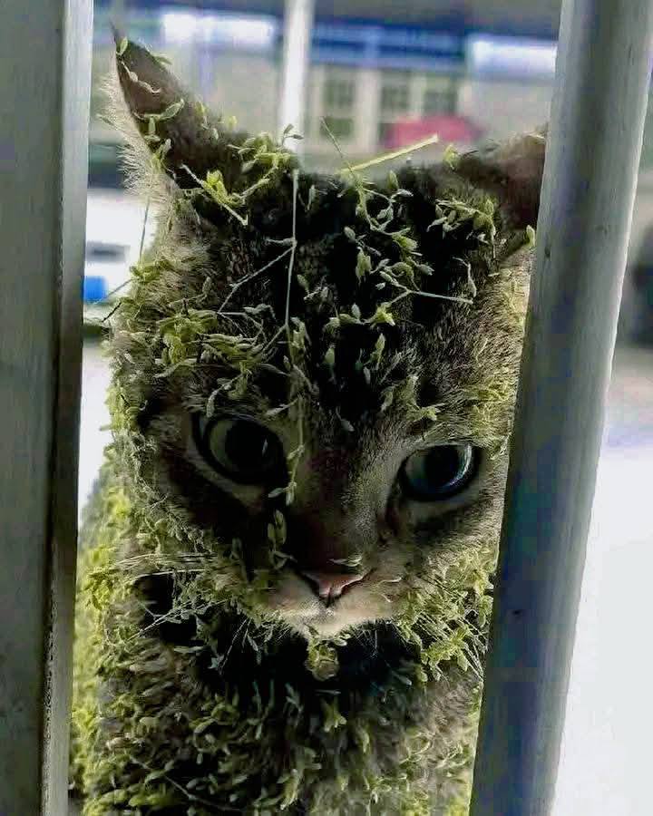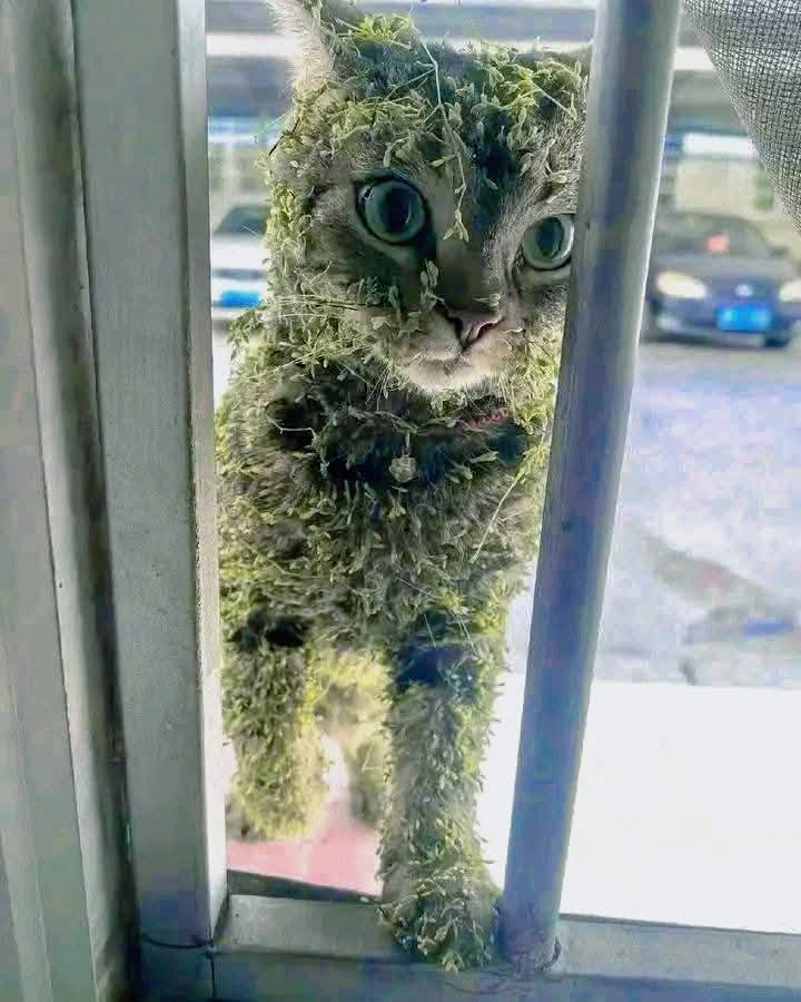 Then—there he was. At the window. Except this wasn’t the dignified Simba I knew. His fur was plastered with hundreds of tiny burrs and seeds, transforming him into a walking, unintentional piece of botanical art. The sight stopped me cold before bursting into laughter.
