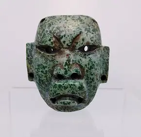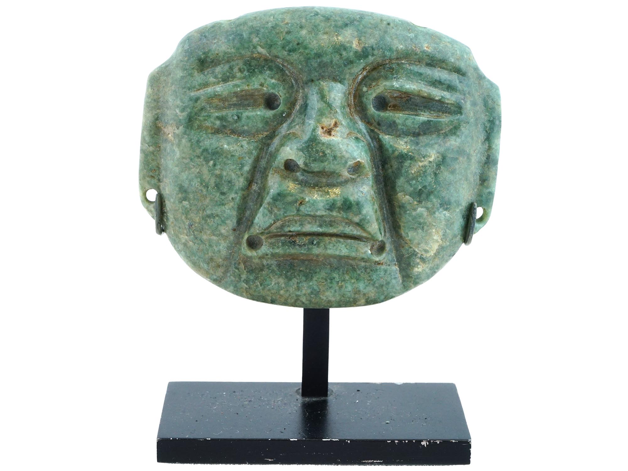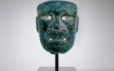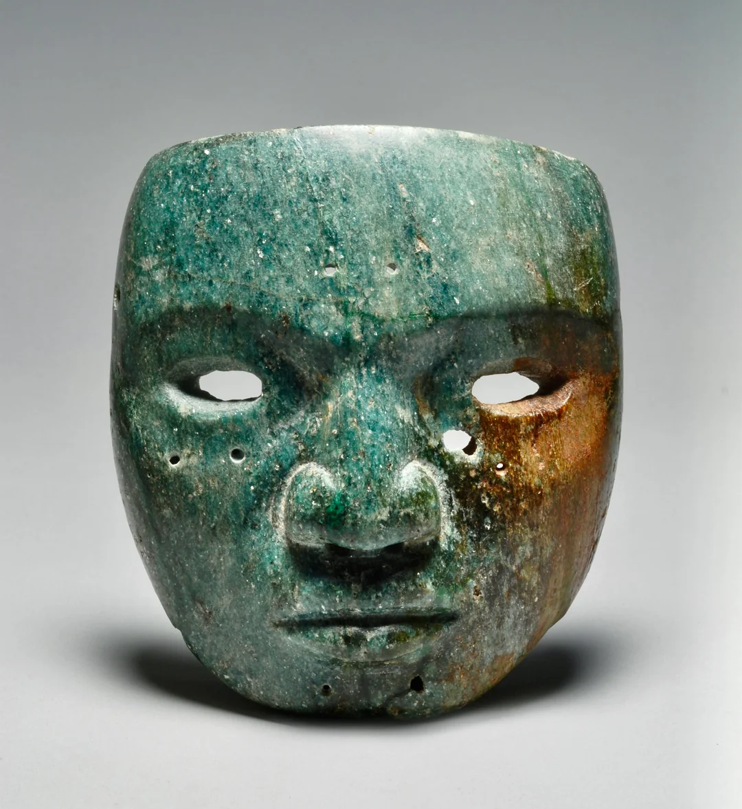 Maya masks from 300 BCE to 300 CE, often carved from jadeite, serpentine, or greenstone, represent the early florescence of Maya artistry and religious symbolism. During this period, masks were closely tied to funerary and ritual practices, serving as offerings to deities or as adornments placed in elite burials to protect and guide the deceased into the afterlife.