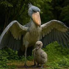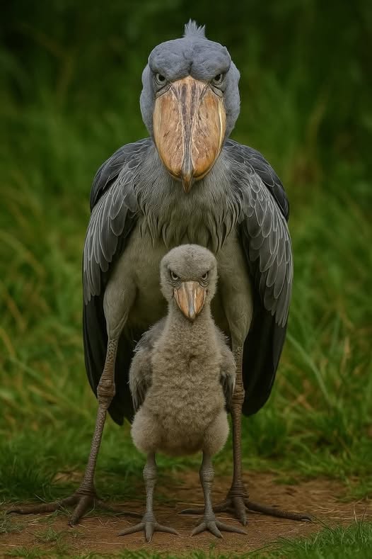 In the wetlands of Africa, one of the most formidable birds in the animal kingdom has a surprising heir — the shoebill chick. Standing before its parent, the tiny fluffball already mirrors the species’ legendary “death stare,” a gaze so intense it feels more royal decree than baby bird expression.