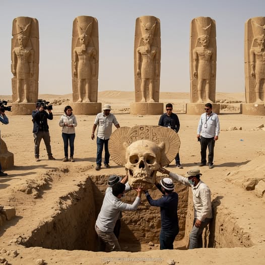 In an astonishing turn of events, archaeologists digging near a row of towering pharaonic statues in the Egyptian desert have uncovered a colossal humanoid skull, unlike anything previously recorded in human history. The massive structure, partially fossilized yet remarkably well-preserved, dwarfs all known skeletal remains and has left experts grappling with questions that challenge the very foundations of archaeology and anthropology.