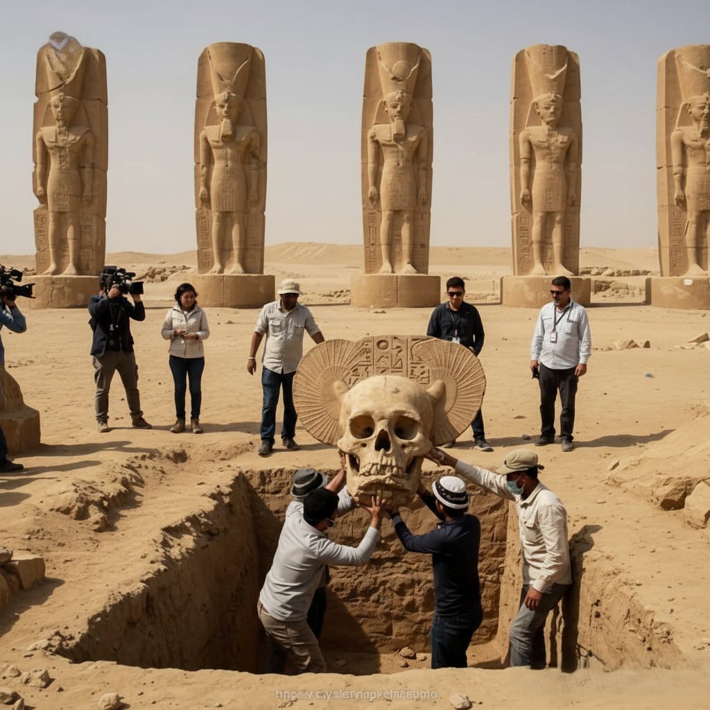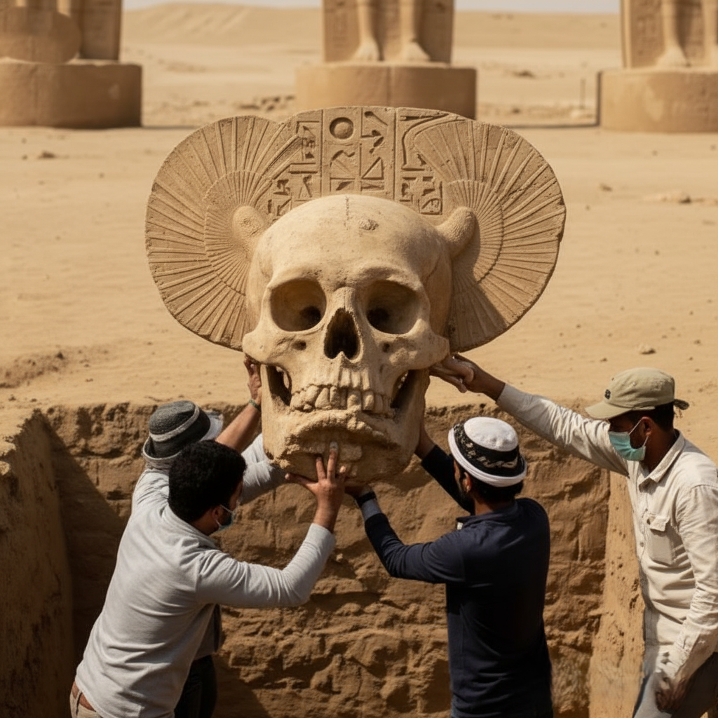In an astonishing turn of events, archaeologists digging near a row of towering pharaonic statues in the Egyptian desert have uncovered a colossal humanoid skull, unlike anything previously recorded in human history. The massive structure, partially fossilized yet remarkably well-preserved, dwarfs all known skeletal remains and has left experts grappling with questions that challenge the very foundations of archaeology and anthropology.