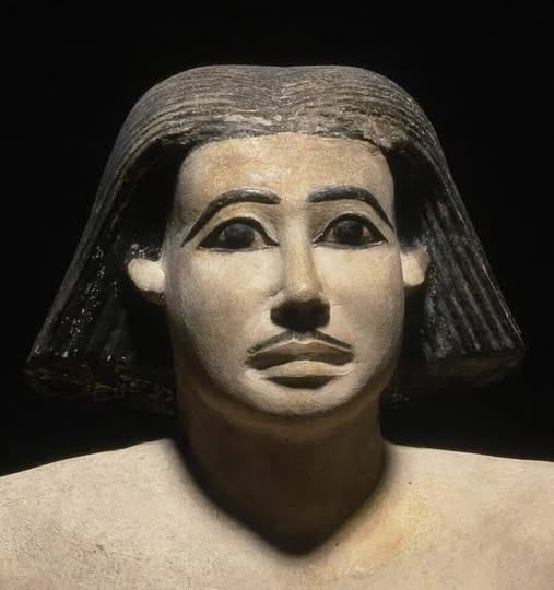 This limestone statue depicts a man named Keki, believed to have been a courtier during Egypt’s Old Kingdom. It stands as a remarkable example of the artistry and style of the period. The finely rendered pencil moustache, often seen on figures ranging from kings to courtiers, suggests it was a fashionable feature among the elite who could commission statues of such refinement.