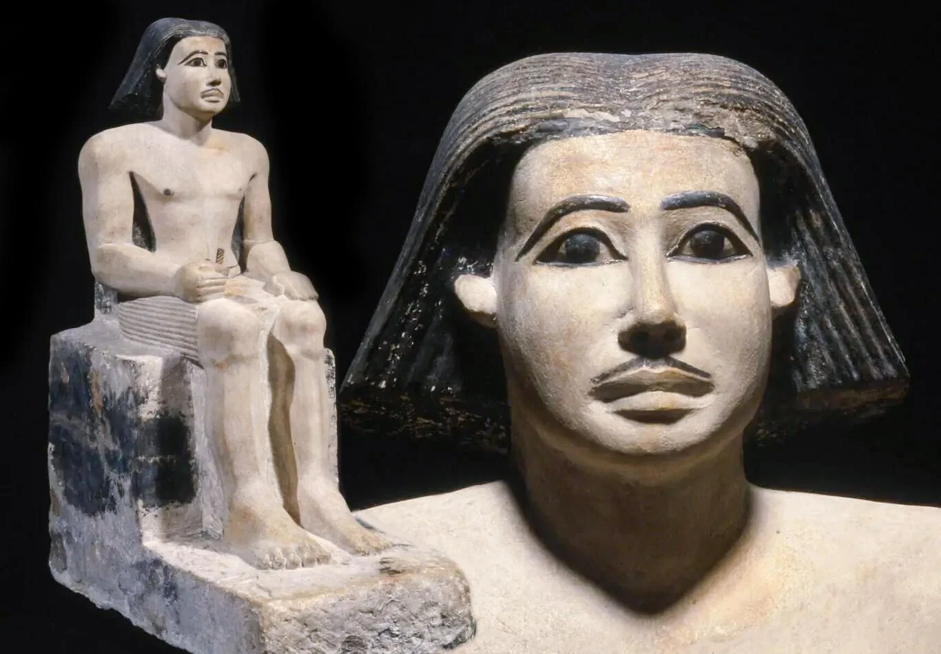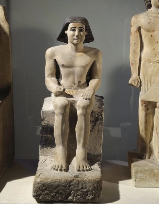 One hand rests on his lap, while the other grasps a clenched fist, possibly once holding a seal or another object now lost. Bare-chested with painted brown nipples, he is dressed in a pleated white linen shendyt (kilt).