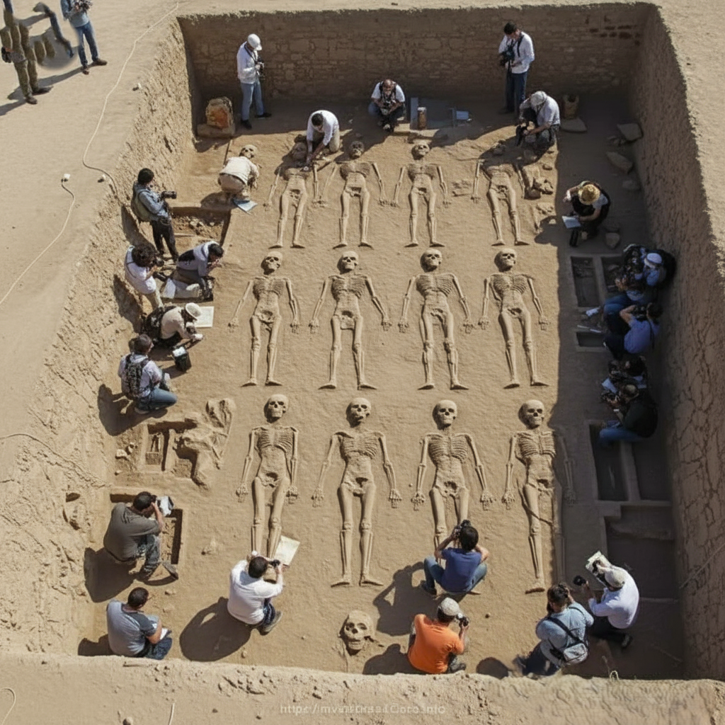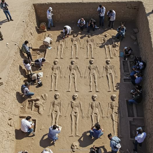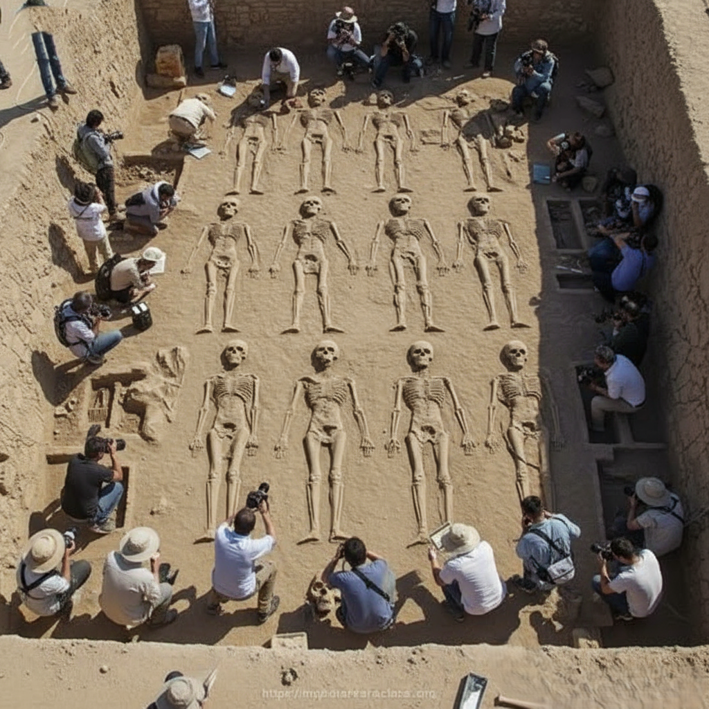 Archaeologists have stumbled upon a discovery so vast and unsettling that it threatens to rewrite the very foundation of human history—an enormous burial site containing dozens, perhaps hundreds, of gigantic skeletons. Each skeleton lies in unnerving symmetry, perfectly aligned as though placed with deliberate precision. The sheer scale of the bones dwarfs the excavation teams, forcing even the most skeptical experts to question what kind of beings once walked this land. Were they an unknown branch of humanity, an elite order of colossal rulers, or proof that the myths of ancient giants were rooted in reality all along?