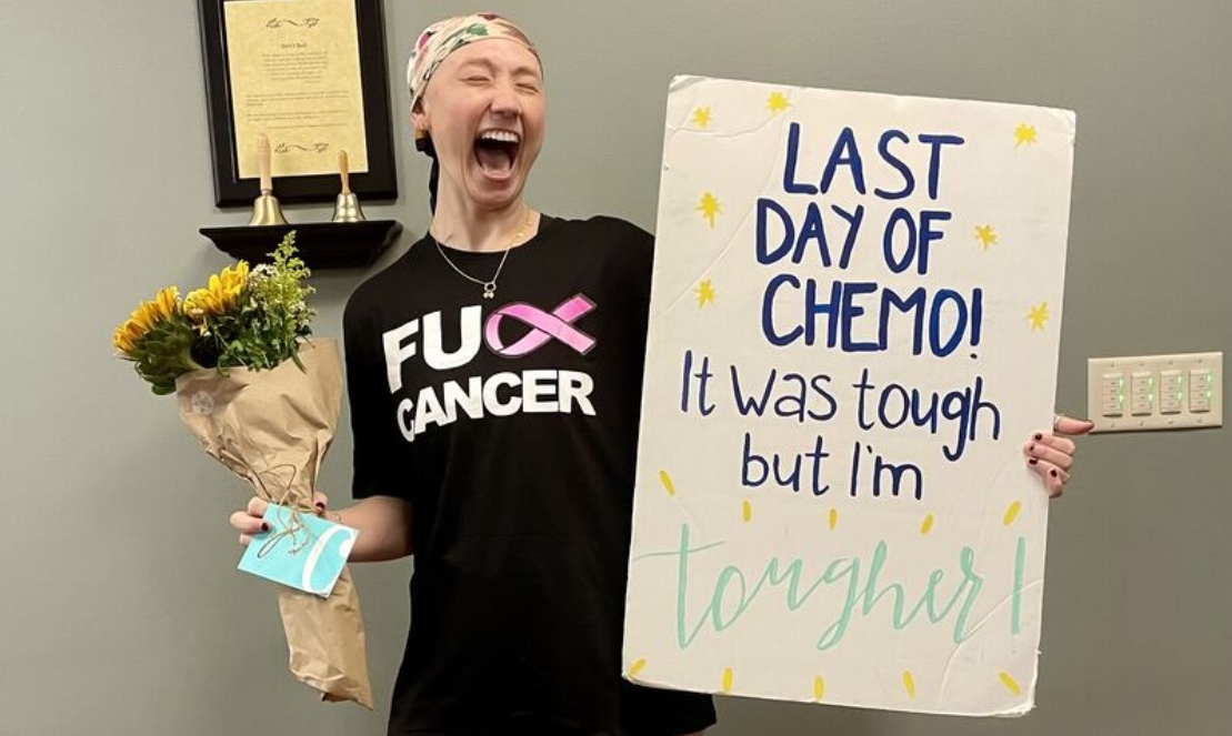 💪 With tears of relief and joy shimmering in her eyes, she holds a sign high above her head: “Last Day of Chemo! It was tough but I’m tougher!” 🙌 That smile—brighter than any victory banner—tells the story of sleepless nights, painful days, whispered prayers, and an unshakable will to keep fighting.