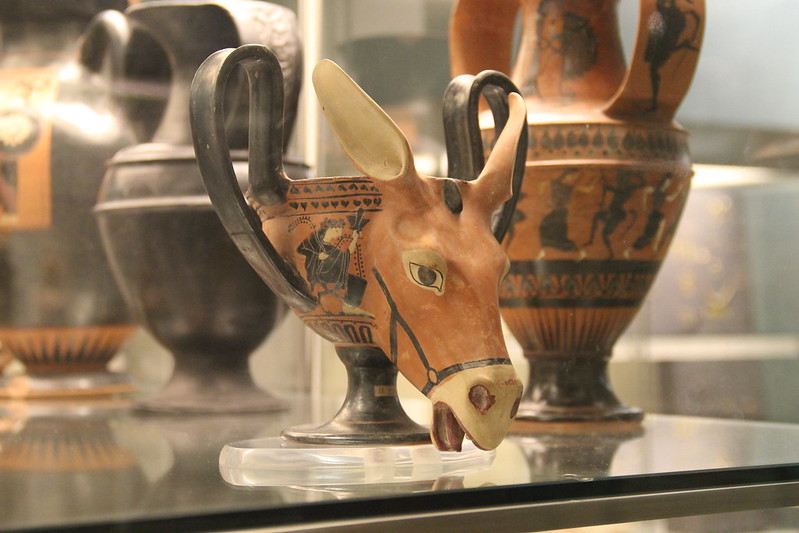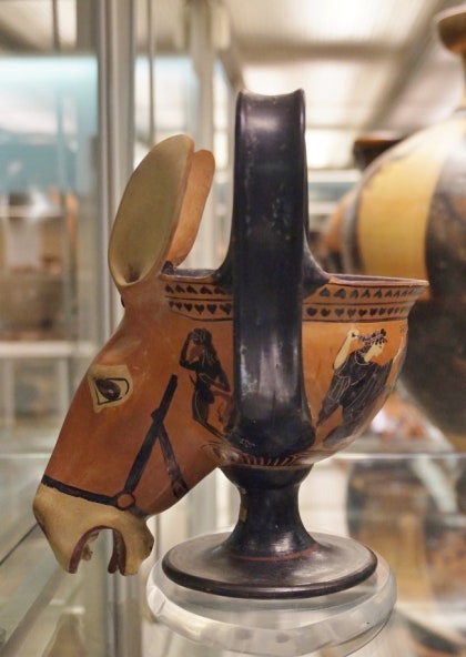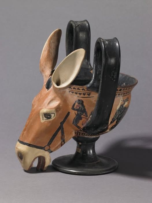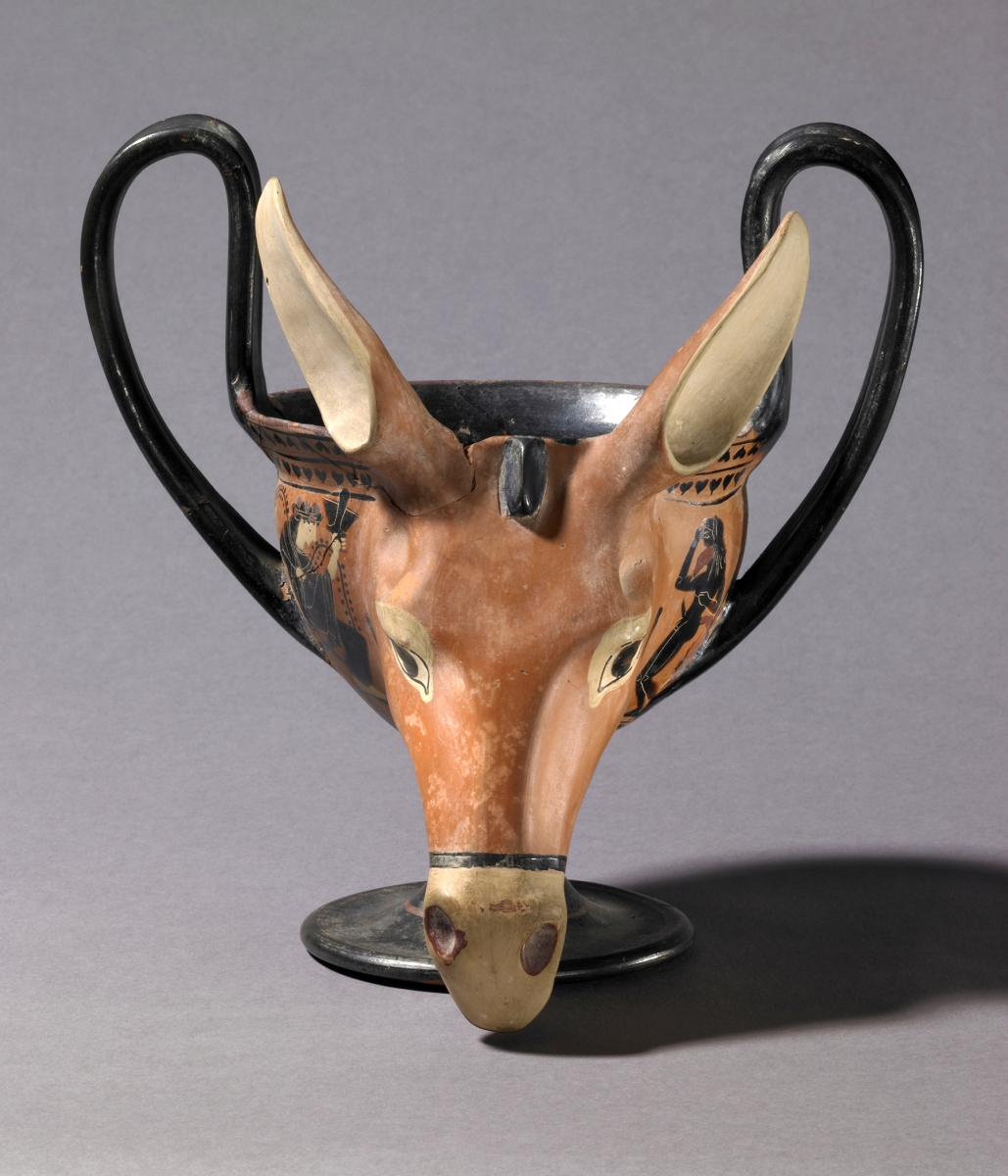 This Attic black-figured kantharos, dating from 520–500 BC, is distinguished by its striking donkey-head attachment.