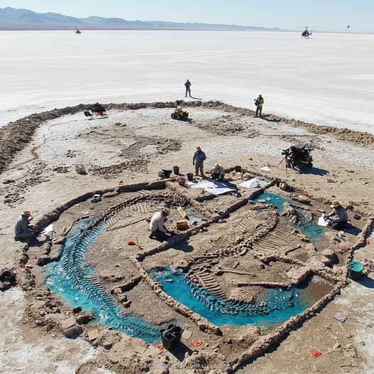 In a remote desert salt flat once thought to be lifeless and barren, a group of archaeologists has made a discovery that could rewrite everything we know about Earth’s prehistoric history. Beneath a thick crust of crystallized salt, they unearthed the massive fossilized remains of what appears to be an enormous aquatic creature — a spine over 30 meters long, with ribs as wide as tree trunks and mineralized fins preserved in eerie perfection.